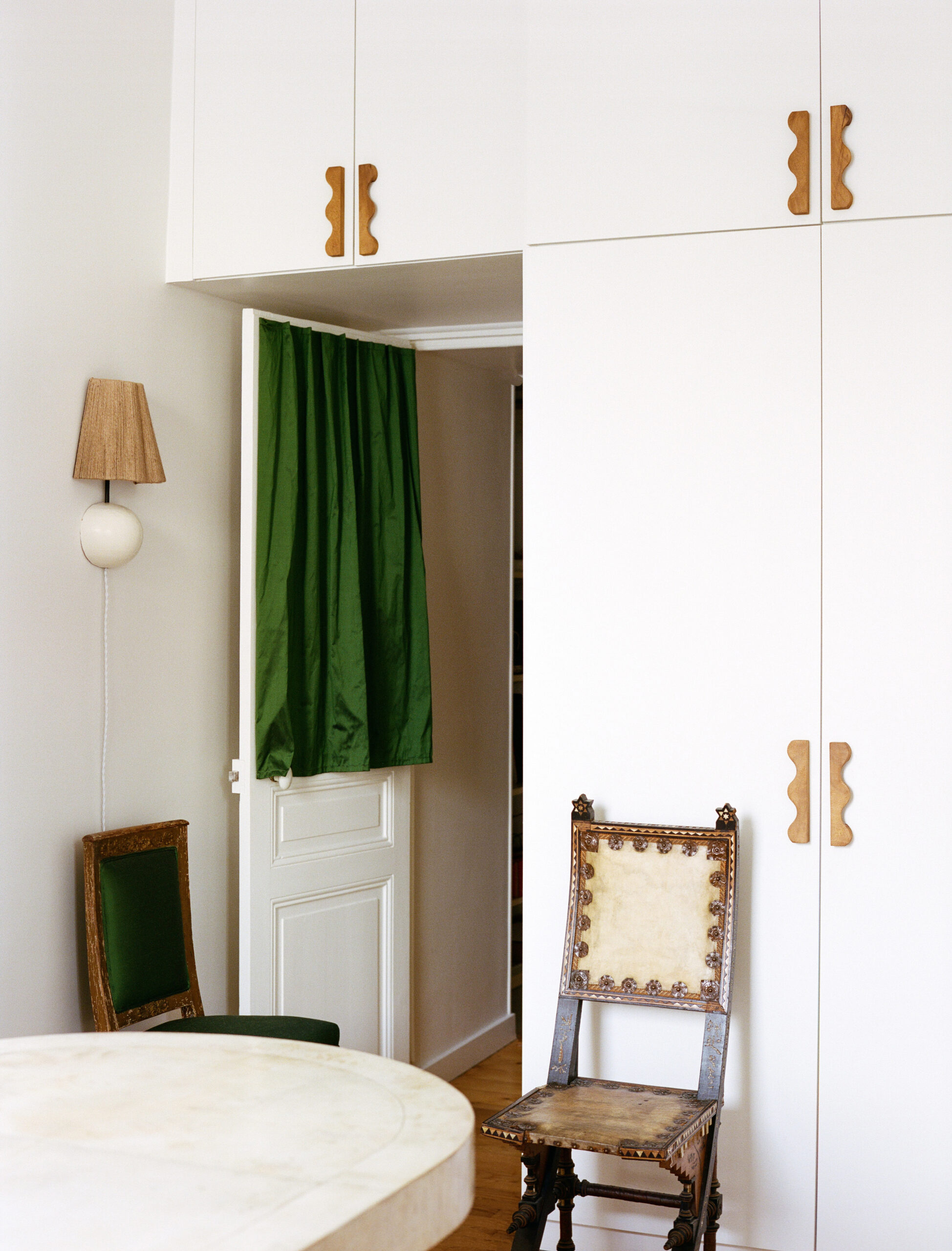 This apartment is a beautiful space between rue de Montpensier and rue deRichelieu, located between the Hôtel Drouot and the Palais Royal gardens. This three-room apartment has been designed as a playground for the owner, a young collector with a passion for neoclassicism and modernism.The living room was designed to be light and bright. The dining room was designed in a neoclassical style, with an Ebur sur-mesure table. In the bedroom, a mahogany and parchment bed from the 1940s is surrounded by columns and capitals fromAntique Rome and a bust of Marcus Aurelius.In the study, a parchment table with rope base and a ceramic wall lamp with jute rope by Ebur contrast with a pair of Empire-period seats upholstered in green silk, and an Italian Orientalist chair by Carlo Bugatti.