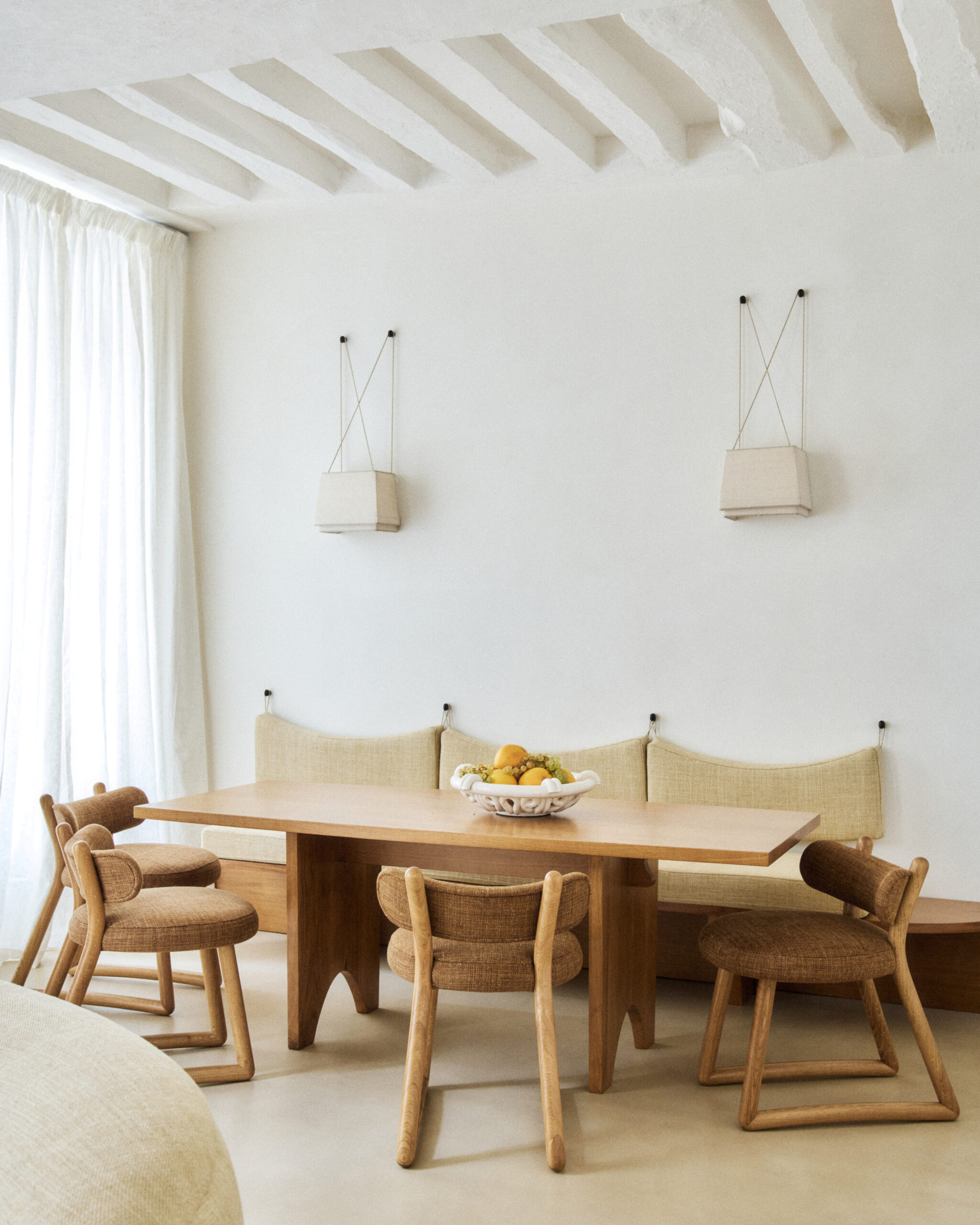 In the living room, waxed concrete floors and lime coated walls harmonize with the soft textures of linen curtains and natural-fiber rugs. A wood and sisal bookcase creates an intimate atmosphere. The living room also features pieces from our collection: the Kola armchairs, Etel sconces and Camel coffee table.