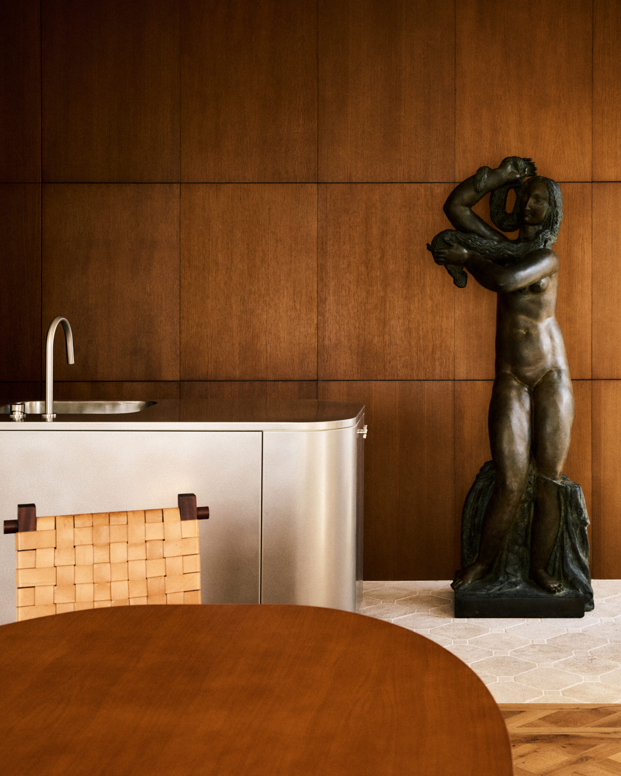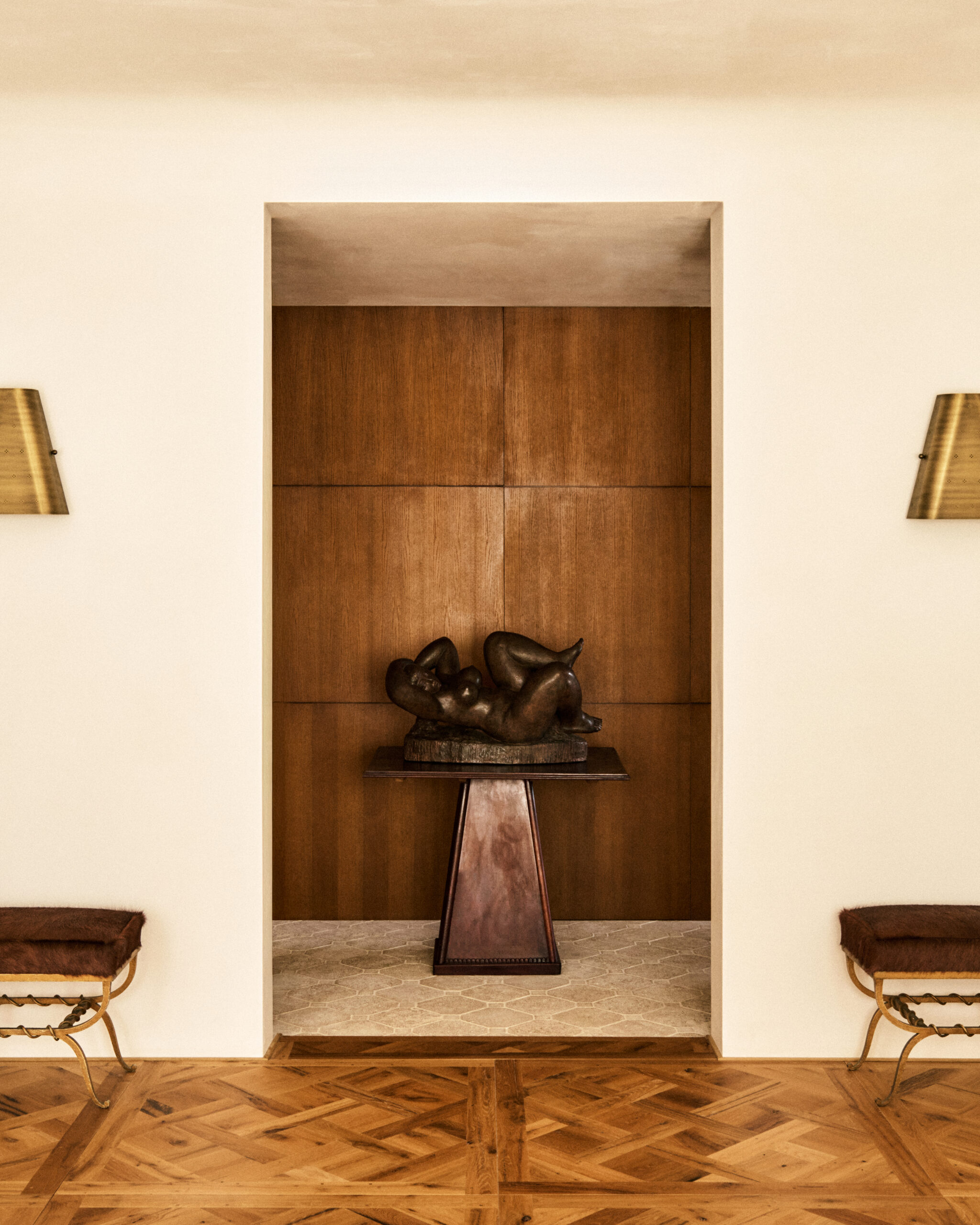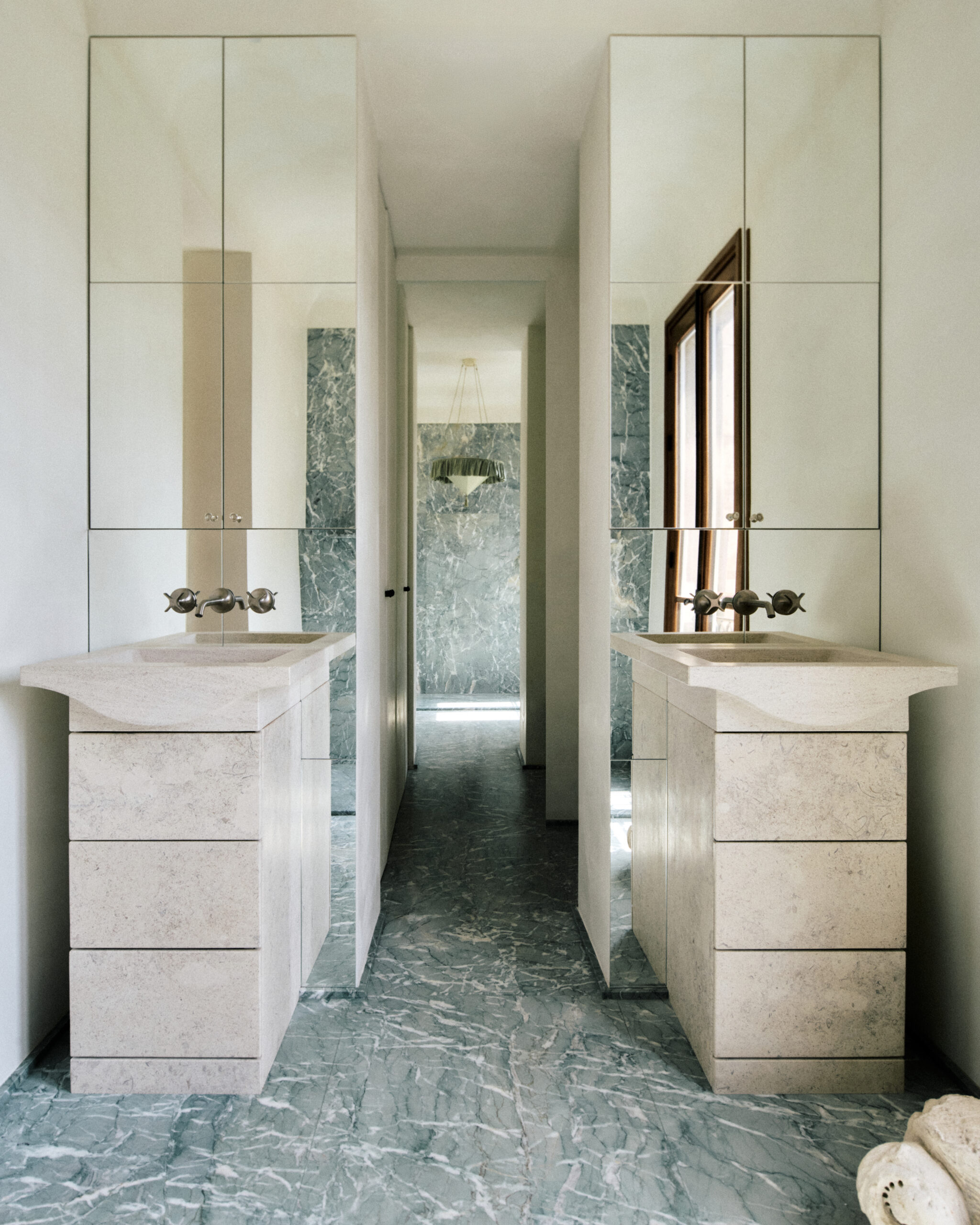 The architectural lines are deliberately simple and delicate. The fireplaces, designed as forms emerging from the walls, contrast with the oak woodwork, while the stainless steel kitchen island and the verde Antigua marble in the master bathroom adds an elegant and sophisticated presence. The whole creates a sensitive interior where the artworks, architecture and natural light interact harmoniously, offering an ideal view of the Archives’ garden.