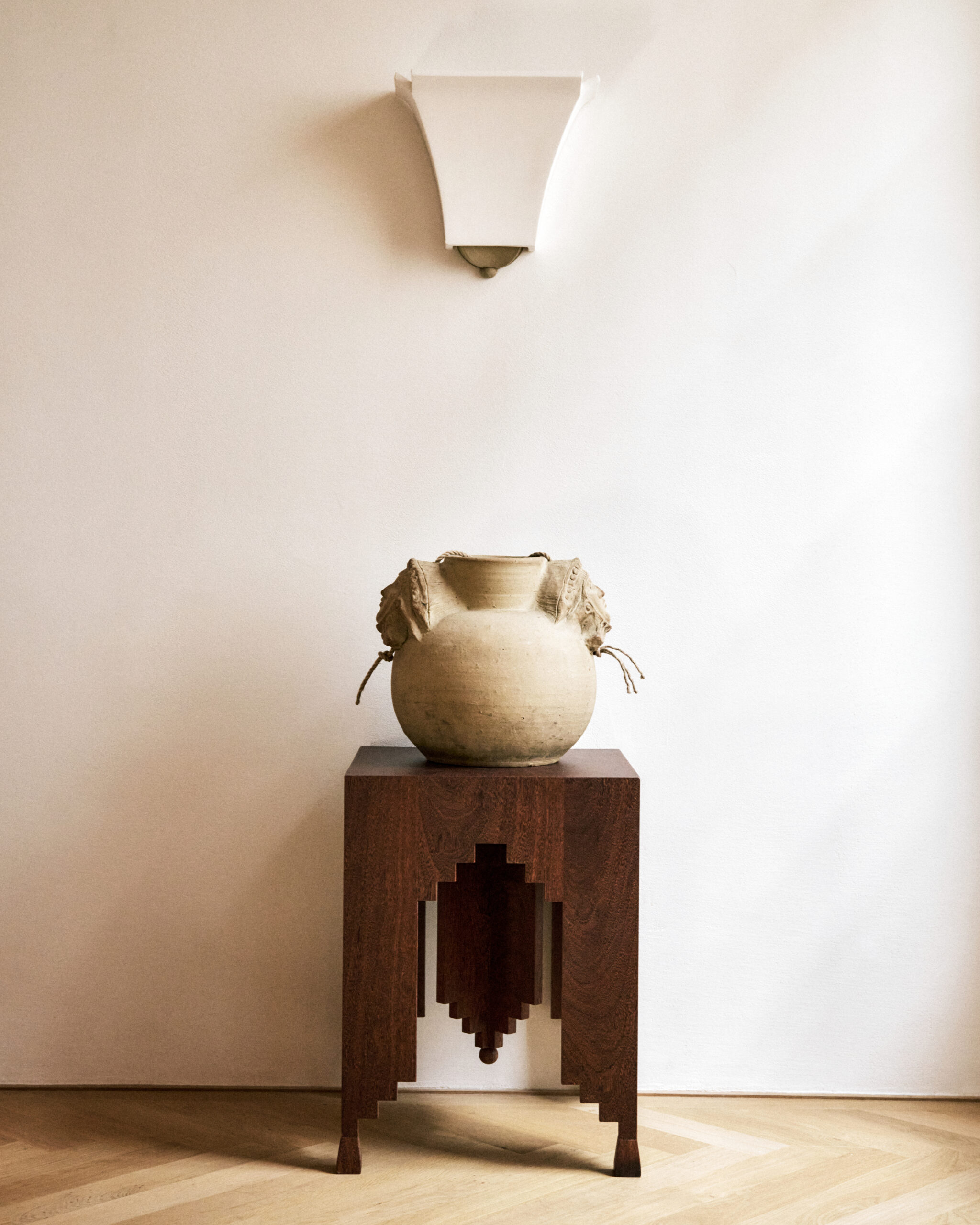 The CHIMERA wall lamp combines molded plaster and raw silk. An inverted silk dome opens into a curved plaster shell, creating a soft and controlled light with subtle shadow effects.